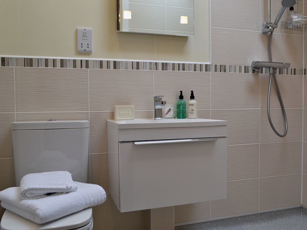 | All en‑suite: Both bedrooms are en-suite with wet‑room style showers. | Wood‑burner & logs included: Perfect for cosy evenings. |